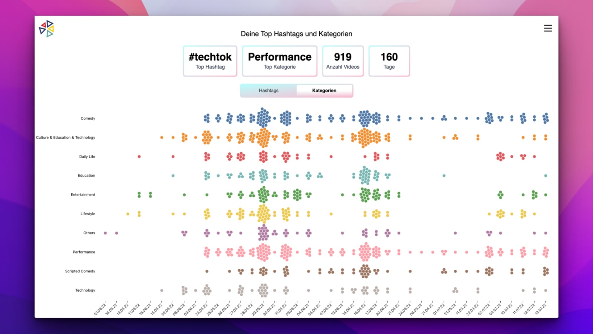 Ohne die Black Box „Algorthimus“ aufzubrechen lassen sich beide Themenkomplexe allerdings schwer bearbeten. Genau hier setzt DataSkope an. Mit Hilfe eines „Clients“, einem kleinen Programm, können TikTok-Nutzer:innen ihre Daten sicher spenden. Der „Client“ stellt eine DSGVO-Anfrage an TikTok und verarbeitet die entsprechenden Daten lokal auf dem Computer. Hier werden personenbezogene Daten, Chat-Nachrichten und Informationen über Dritte bereinigt bevor sie an DataSkop übermittelt werden. Als Dankeschön gibt es eine hübsche grafische Aufbereitung des eigenen Nutzungsverhaltens. In bunten Balken kann ich mir so anschauen wie lange ich einzelne Videos, je nach Tageszeit, anschaue oder welche Themen in welcher Woche besonders häufig in meinem Feed vertreten waren.