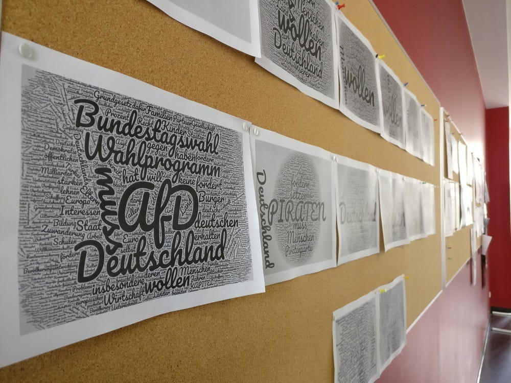 Ein anderes Projekt, das mich sehr begeistert hat, waren die Wortwolken von @Konkludenz. Die Idee dazu entstand während der Veranstaltung an unserem Tisch im Heckencenter (dem Raum mit vielen Tischen und Steckdosen): aus den Wahlprogrammen aller Parteien erstellte @Konkludenz Tag-Clouds oder Wortwolken. Dabei wird die Häufigkeit der Wörter gezählt und je häufiger eines im Wahlprogramm vor kommt, desto größer erscheint es in der Wortwolke. Nach einigen Stunden war eine große Pinwand im Gang voller A4-Blätter mit ausgedruckten Tag-Clouds. Das sah sehr beeindruckend aus und es machte sehr viel Spaß zu erraten, welche Wortwolke zu welcher Partei gehörte. Das ging erstaunlich gut! Alle Wortwolken und ein Text über das Projekt findet sich HIER.